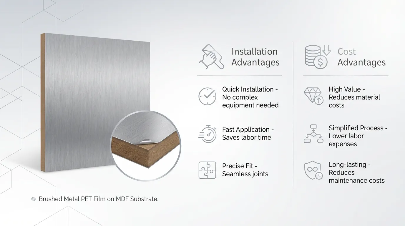 Lightweight and easy to handle, it reduces transportation and labor costs. Installation requires no complex tools—simply apply the film directly. No painting or welding is needed, significantly improving efficiency and reducing construction time. It works with a wide variety of substrates, including panels, metal, and plastics, making renovation and surface upgrades quick and convenient.
